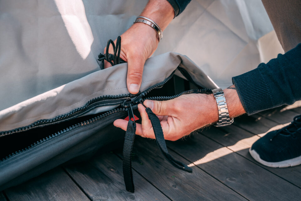 Den kraftiga dragkedjan på Bag'in säkerställer ett helt slutet system som skyddar dina utemöbler mot väder och vind