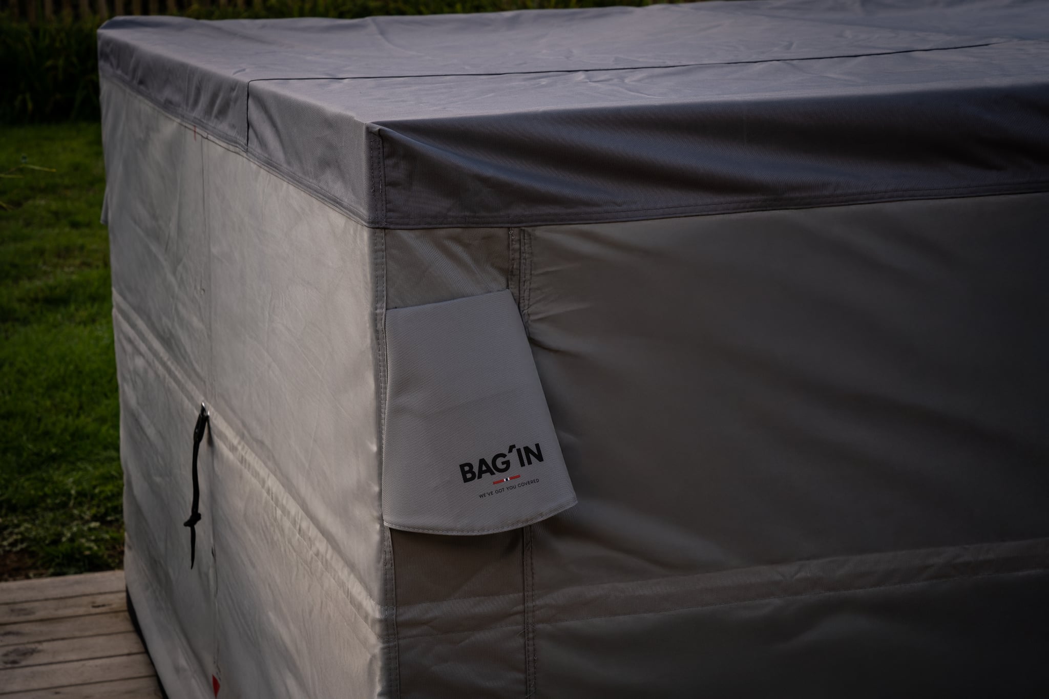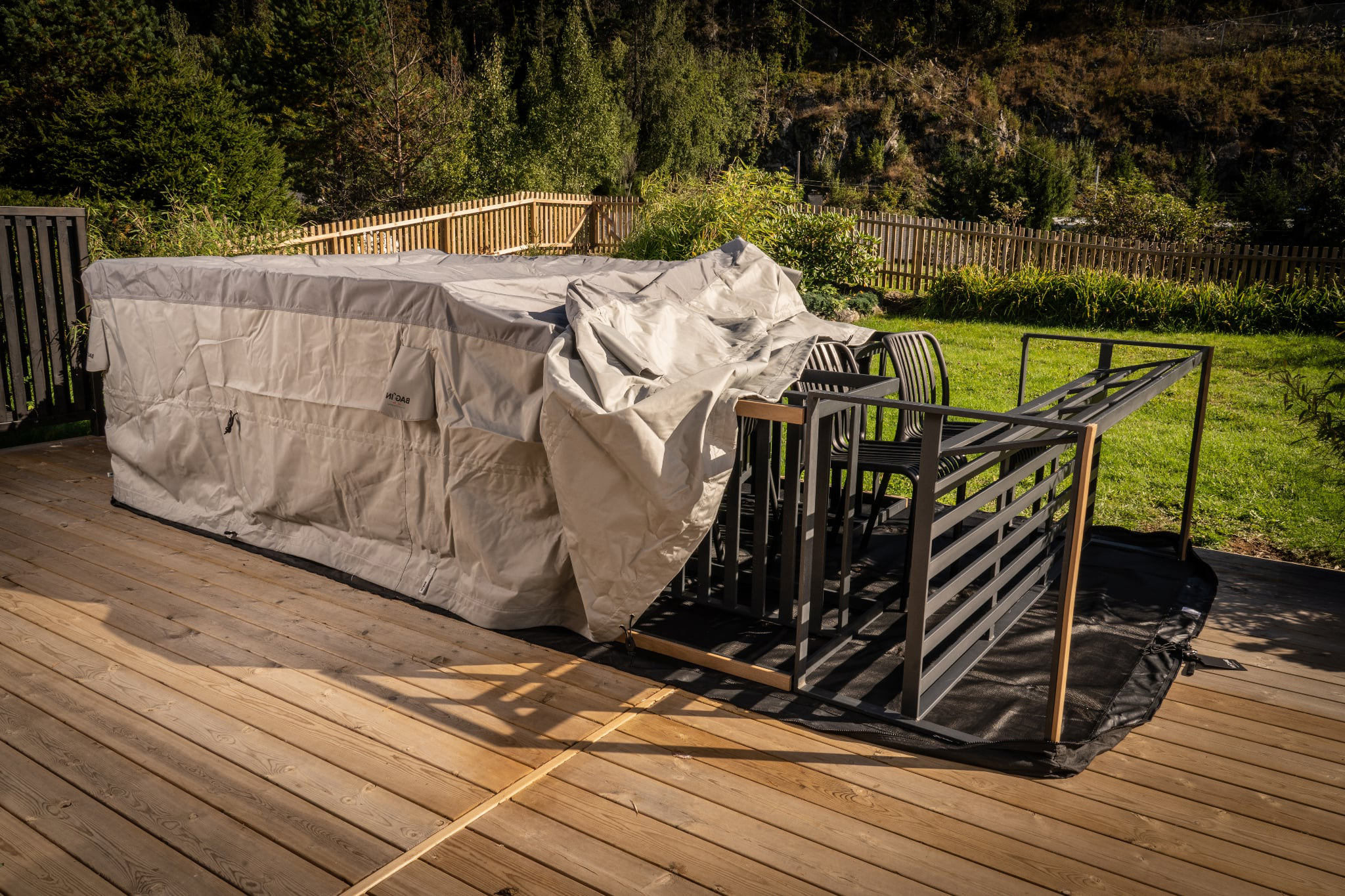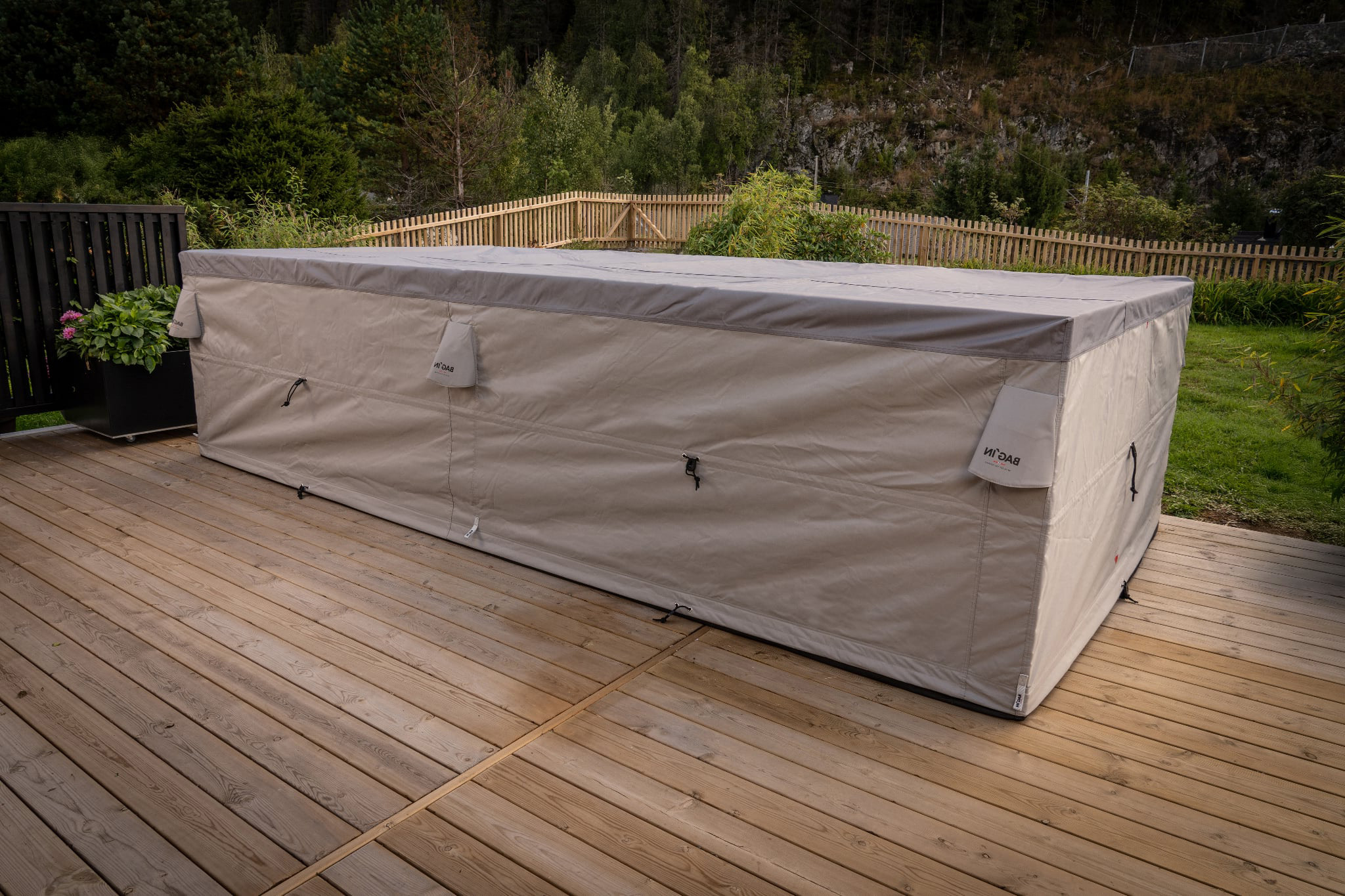 För att tyget ska sitta tätt runt möblerna är det integrerat spännband på två ställen – längst ner och i mitten av locket. Banden är tillverkade i högkvalitativ polyester och har testats under mycket krävande förhållanden. Att ha tyget åtdraget runt föremålen på insidan minimerar också vindbruset vilket gör det redan tysta materialet ännu tystare.